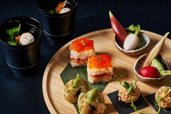 牛しぐれ巻き/鮭ととびっこの押し寿司/桜海老のすり身揚げ/香の物