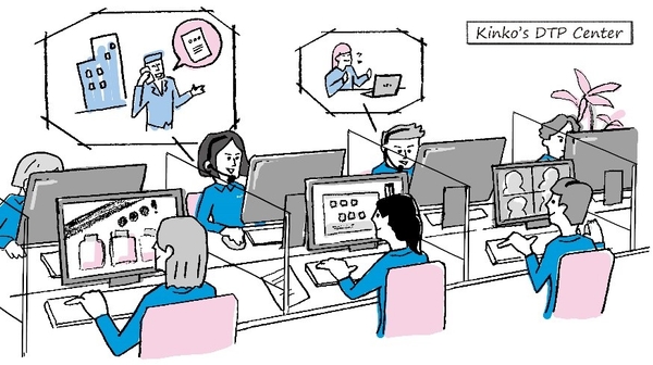 キンコーズの店舗では、紙面の割り付けなど印刷用データをPCで作成するDTPオペレーターが常駐*2し、顧客の入稿サポートを行っています。この度開設した「DTPセンター」は、社内認定を受けた専門性の高いDTPオペレーターを専任スタッフとして配置し、より高度な対応や処理能力によって各店舗を支援するだけでなく、オンライン受付の印刷にも対応します。この入稿サポートを通じて、顧客のプリントマネジメントを最適化することをオンラインでつながり実現します。