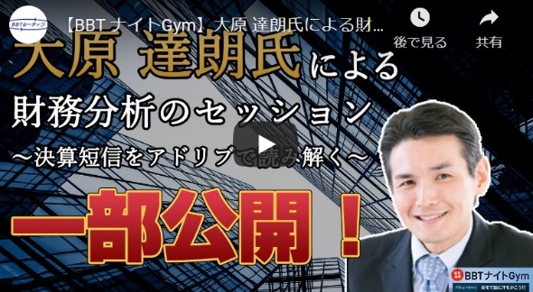 BBT大学准教授の大原達朗氏が、決算短信をアドリブで読み解く回を特別に公開しています。決算短信の読み方のポイントを楽しく学ぶことができます。