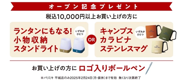オープンを記念し、1月24日(金)~2月24日(月)まで、メガネをお買い上げの方にパリミキオリジナル・ロゴ入りボールペンをプレゼントいたします。また、期間中税込10,000円以上お買い上げの方に小物収納スタンドライトかステンレスマグをプレゼントいたします!