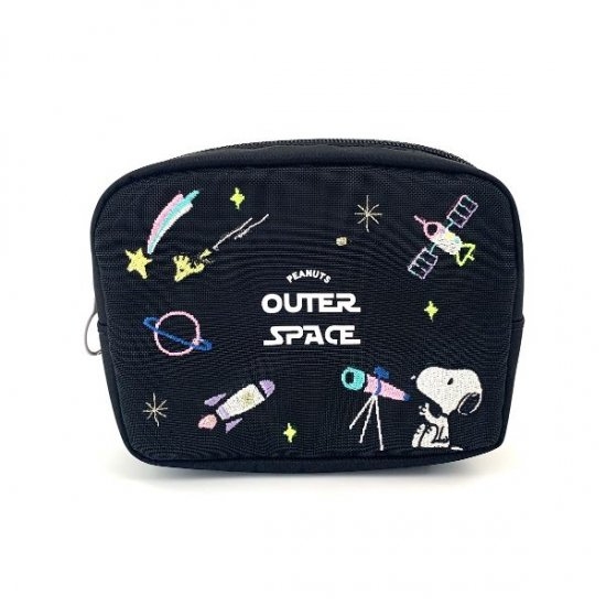 天体観測をするスヌーピーってなんだかレア。夜空には宇宙船や流れ星に惑星とカラフルで楽しい世界が広がります♪宇宙柄のポーチって神秘的で素敵です。