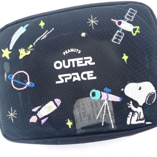 今年の秋はスヌーピーで天体観測を。ブラックカラーのメッシュ素材に宇宙が広がるボックスポーチ♪