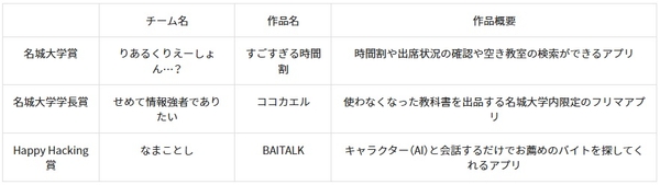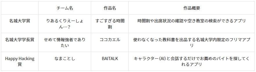 参加者投票で最も票を獲得した作品に贈られる「Happy Hacking賞」などその他の入賞チームとプロダクトの内容は次の通り。