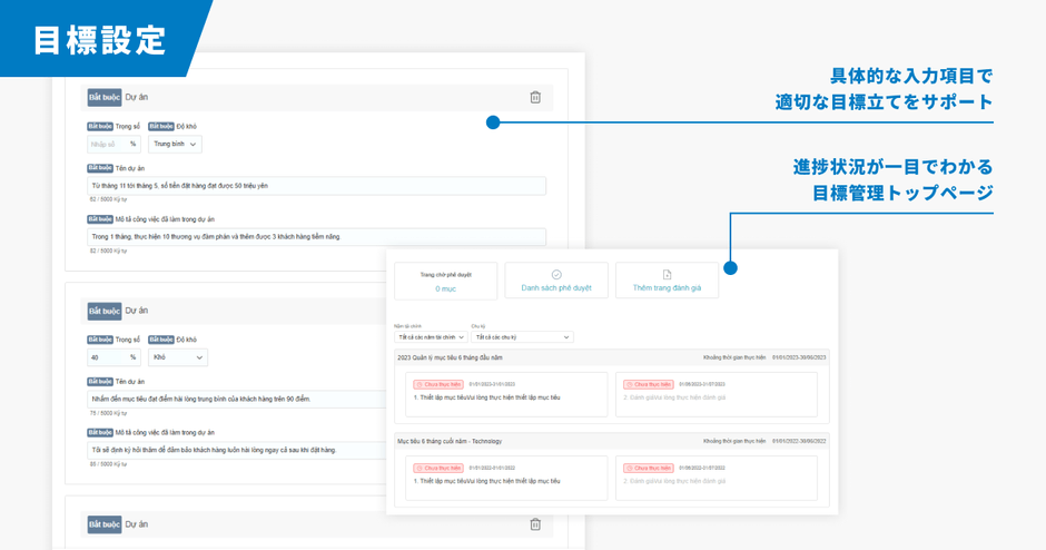 ベトナム版「CYDAS」は、日本版「CYDAS」のワークエンゲージメントを高める仕組みはそのままに、ベトナムの働き方・文化に合うように機能をカスタマイズ。目標管理のフォーマットも搭載しているため、導入後すぐにご利用いただけます。すでに評価シートをお持ちの場合も、評価項目が柔軟に設定できるため、そのままシステム上に再現できます。