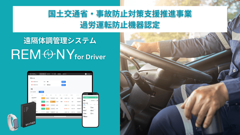 ヘルステック事業を展開する株式会社MEDIROM MOTHER Labs(本社:東京都港区、代表取締役社長:植草 義雄、以下「マザーラボ」)が開発する、世界初*充電不要のスマートトラッカー「MOTHER Bracelet」(以下「MOTHER」)を用いた運送事業者向けの遠隔体調管理システム 「REMONY for Driver」が国土交通省の事故防止対策支援推進事業における過労運転防止認定機器として選定され、補助金対象機器となりましたことをお知らせします。