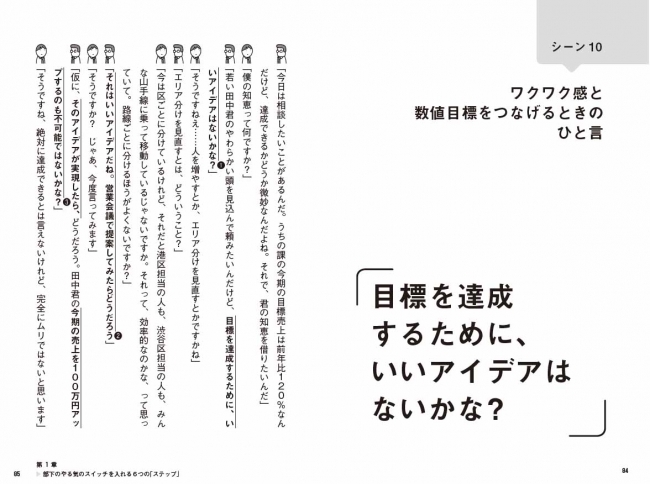 部下がやる気になる「ワクワクエンジン」をかけるために必要なのが、適切な声かけです。本書では、部下の成長度合いや悩みのタイプから33の「シーン(場面)」を設定。
