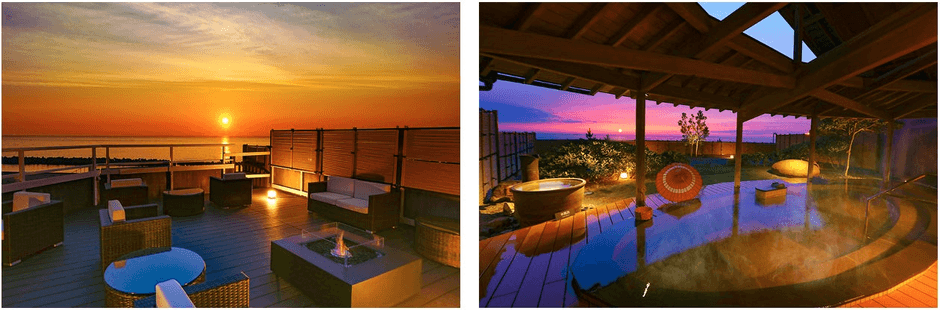 宿の目の前に広がる日本海に沈む夕日を、ロビーやテラス、客室、そして露天風呂から眺める、非日常のひと時をお過ごしください。