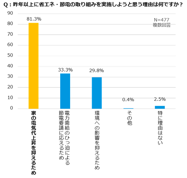 省エネ・節電に積極的に取り組む理由を聞いたところ、約8割(81.3%)の人が「家の電気代上昇を抑えるため」と回答し、他の項目を大きく抑えて最も多い結果となりました。節電要請に応えたい気持ちや、近年高まりつつある環境への意識がありつつも、現状では日常の生活と密接にかかわる「電気代の上昇」を強く意識している人が多いようです。