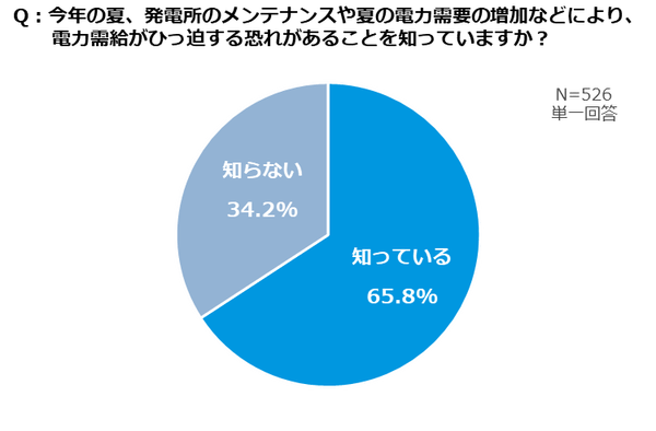 「今年の夏、電力需給がひっ迫する恐れがあることを知っていますか?」との質問に、約7割(65.8%)の人が「知っている」と回答しました。また、「電気代上昇によって家計への負担の高まりを感じていますか?」との質問には、約8割(78.9%)の人が「感じている」と回答し、多くの人がこの夏の電力需給や電気代を意識していることが明らかになりました。