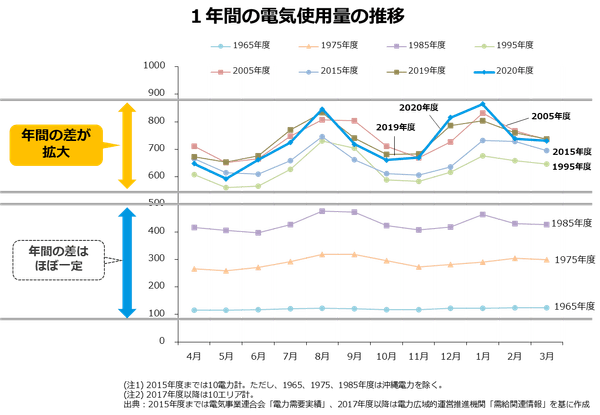 資源エネルギー庁の調査によると、夏の日中(14時ごろ)の一般家庭における電力消費は、照明や冷蔵庫を抑え、エアコンが最大(58%)で約6割を占めていると言われています。さらに、以前は、電気使用量は年間を通じてほぼ一定だったのが、近年、季節によってその差が拡大しています。夏と冬に電気使用量のピークを迎えていることから、季節によって使用頻度が大きく変わるエアコンも、夏場の電力需給に与える影響は大きいと考えられます。