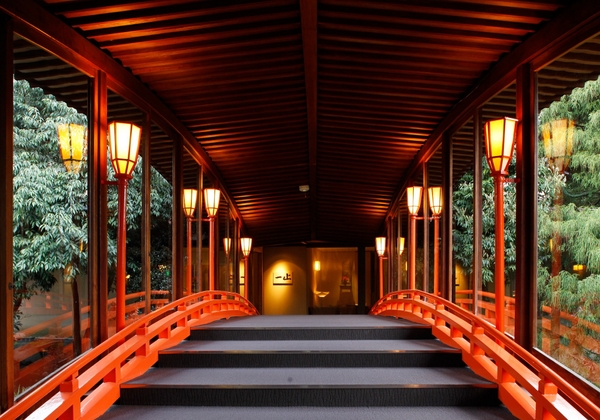 館内にある朱色の太鼓橋。ここから中庭の方に目を向けると、美しい紅色に染まる紅葉を眺められます。朱色の太鼓橋と美しい紅葉が一体となり、来館するゲストを迎えます。