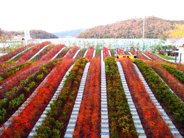 施設内にある「つむぎ茶畑」は、茶の木と交互に植えられたドウダンツツジが赤く色づき、まるで遠州綿紬の縞柄模様のように、赤と緑のコントラストを楽しめます。界 遠州の秋の風物詩です。