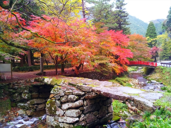 界 加賀より車で約15分の山中温泉に位置する鶴仙渓。砂岩の浸食によってできた風光明媚な自然の渓谷。2つの伝統的な橋の間に、川沿いの遊歩道やピクニック エリアがあり、散策をしながら紅葉を楽しむことができます。