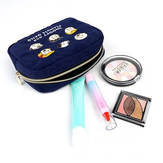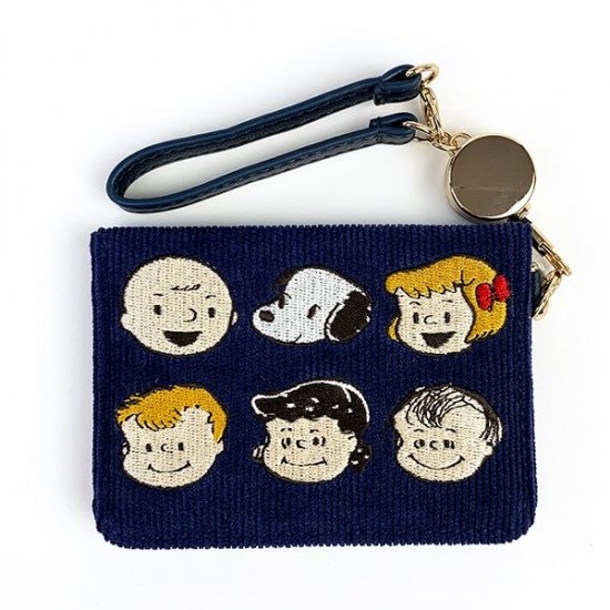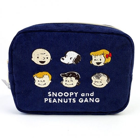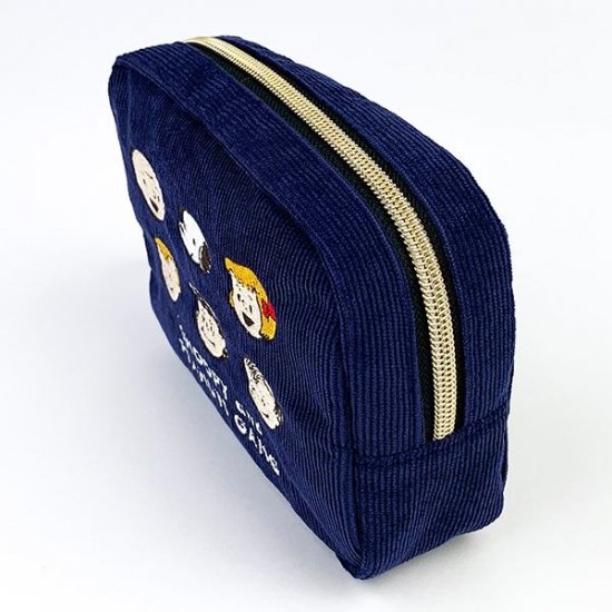 スヌーピーとフレンズのお顔が並んだ、キュートなデザインのポーチです。ネイビーのコーデュロイ素材は、この季節にはピッタリですよね。