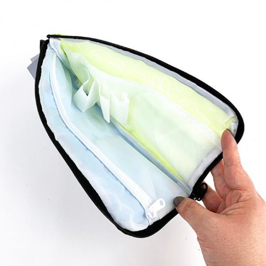 サイズは110×140mmです。ファスナーにはブルーのサテンリボンもついていて、アクセントになっています。
