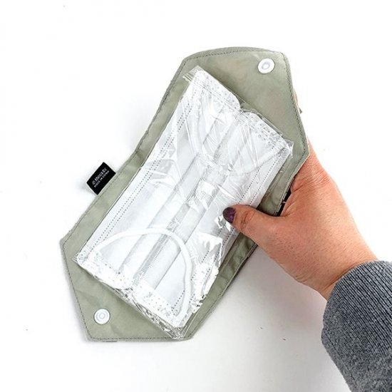 このようにマスクを置いたら、2つに折りたたんでボタンを留めるだけです。食事の際にはずしたマスクの置き場所に困ること、ありますよね。こんなマスクケースがあれば、万事解決です。