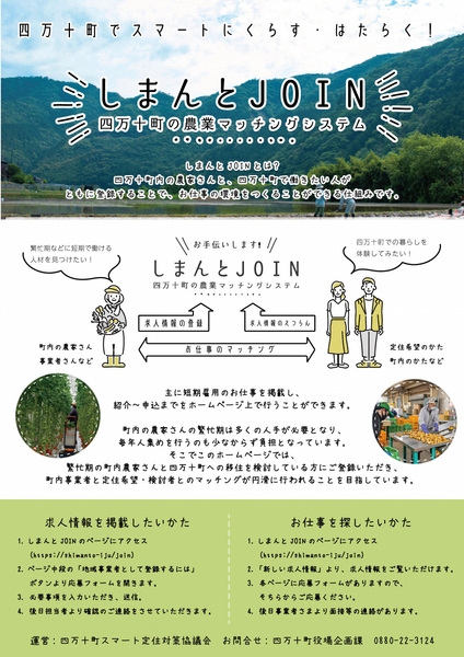 詳しくは、しまんとJOINホームページまたは四万十町役場企画課までお問い合わせください。
