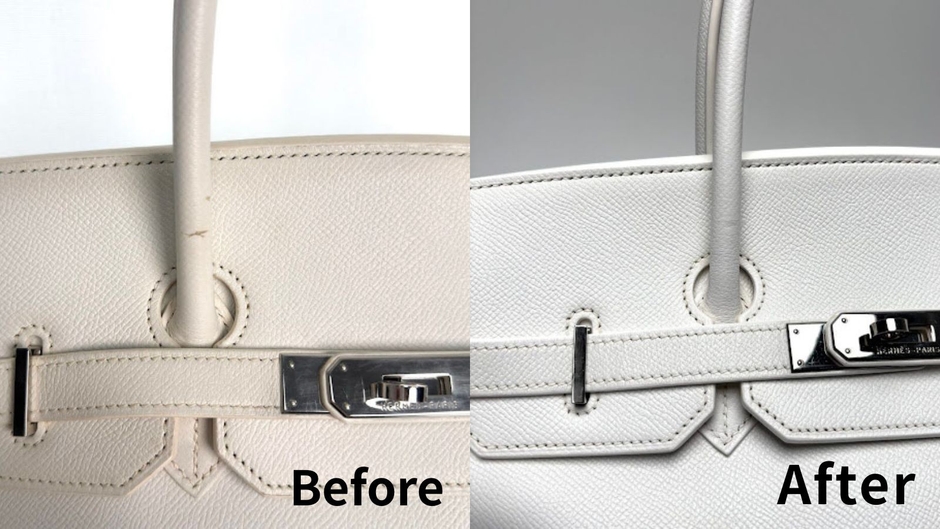 実際にお預かりしたのは、白(ホワイト)のエルメス・バーキン。日焼けによって黄ばんでしまいましたが、全体を丁寧に補色することで、元の色味に近い発色へとよみがえり、全体の印象がぐっと明るくなりました。
