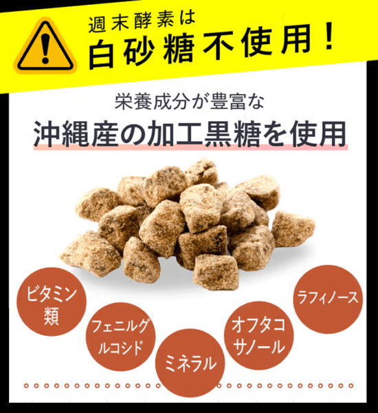 週末酵素は太りやすいと言われる白砂糖は不使用です。白砂糖に比べミネラルが豊富と言われている栄養成分が豊富な沖縄産黒糖を使用しています。
