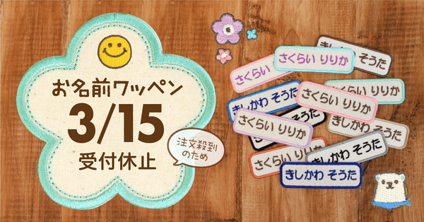入園・入学準備にとお買い求めいただいているお名前ワッペンが、ご注文の集中で製造が追いつかなくなり、お届けまでにお時間がかかる状況となってまいりました。そのため、受注受付を一時的に締め切らせていただきます。