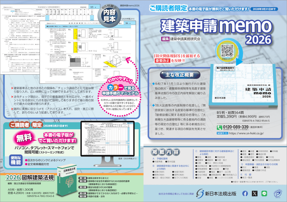 新日本法規出版株式会社(所在地:愛知県名古屋市中区、代表取締役社長:河合誠一郎)は、新刊『建築申請memo2026』(編集:建築申請実務研究会)を2026年1月22日(木)に発売いたしました!