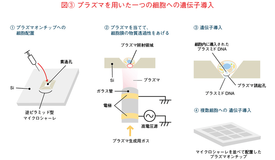 しかしこの方法では、貫通孔と細胞に距離ができる可能性は排除できませんし、プラズマが複数の細胞に照射される可能性もありました。そこで次に考えたのは、「一つの細胞に、確実にプラズマを照射する」ための改良です。ここで私が注目したのは「結晶異方性エッチング」という技術でした。(図(3))これはシリコン基板をある条件下で腐食させるとV字型の立体構造を形成できるという技術。これもMEMSの開発中に獲得した知見の一つです。この微細加工法を用いることで、シリコン基板を逆ピラミッド状に加工して漏斗(ろうと)のようにすると、底部の貫通孔に向かって誘導にすることが可能になります。この漏斗に落ち込んだ細胞に下からプラズマを照射することで、一つの細胞に確実に照射するという仕組みが実現したのです。今日、さまざまな研究機関と共同で、改良型のプラズマオンチップを用いた研究が進められています。