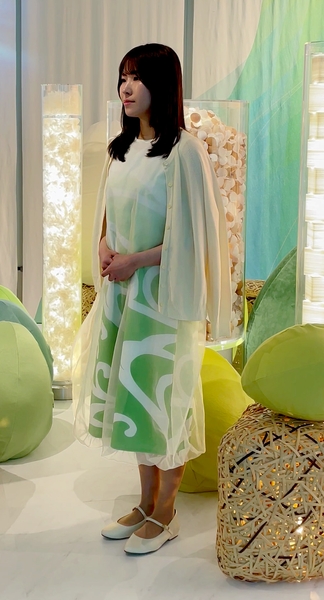 古くから京都に伝わる水を表す伝統文様“観世流水文”をモチーフにしてデザインしました。ワンピースとそれを覆うタマゴ型のオーガンジーは、生命の源たるタマゴの白身と黄身、それを外界から守る天然の超高性能バリア “卵殻膜”をイメージしたスタイルとしました。