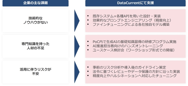 本サービスでは、前述のデータ志向型の環境整備に加え、生成AIを導入・活用するうえで企業においてよくある課題に対して、DataCurrentの強みを活かした総合的なサポートを提供いたします。