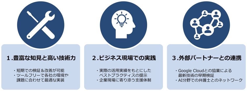 技術革新や法的規制など当面は激しい変化が続くことが見込まれる生成AI分野において、攻めと守りの両輪から、企業にとって持続的に成果を創出する仕組みを提供してまいります。