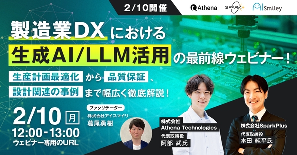 AIポータルメディア『AIsmiley』を運営する株式会社アイスマイリー(東京都渋谷区、代表取締役:板羽晃司)は、2025年2月10日(月)12時から製造業DXにおける生成AI・LLM活用をテーマにウェビナーを開催します。