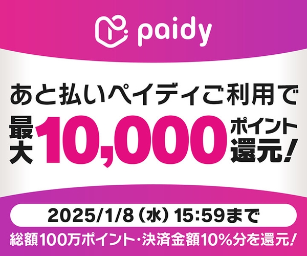 ・キャッシュバックは、決済画面であと払い(ペイディ)を選択した場合のみ対象です。ペイディカードの利用は対象外となります。
