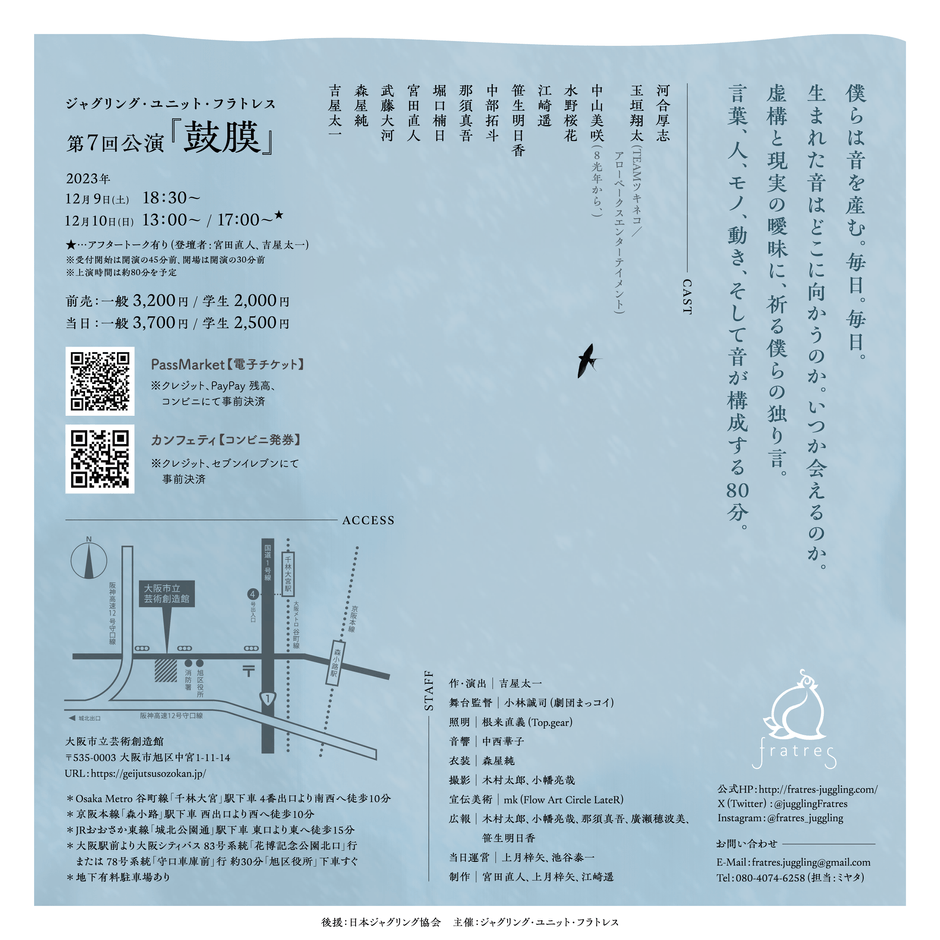 ジャグリング・ユニット・フラトレス主催、第7回公演『鼓膜』が2023年12月9日 (土) ~2023年12月10日 (日)に大阪市立芸術創造館(大阪府大阪市旭区中宮1-11-14)にて上演されます。