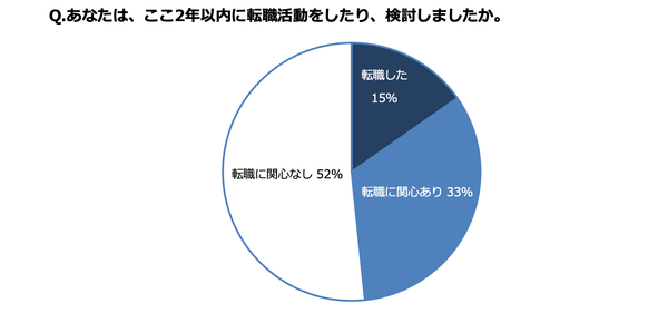 - ここ2年以内の転職実施者は15%、関心者は33%。