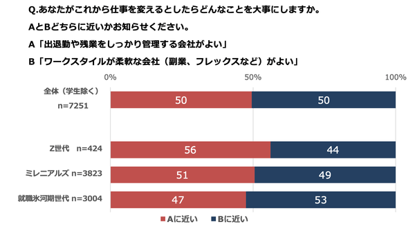 Z世代は「1つの会社に居続けるリスク」も38%が感じている(就職氷河期世代+9pt)。 - 「ワークスタイルが柔軟な会社」と「出退勤・残業管理する会社」は50%ずつで拮抗。