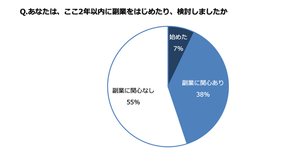 - フルタイム勤務者のうち2年以内の副業開始は7%にとどまるが、副業への関心者は38%。