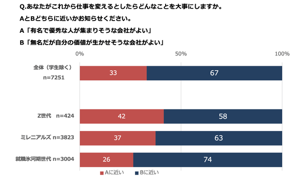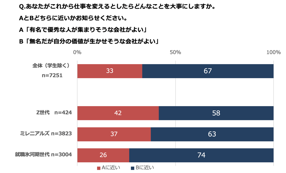 一方、働きたい会社の環境に関して、「無名だが、自分の価値が生かせる会社がいい」67%が多数派。就職氷河期世代は74%と、Z世代よりもチャレンジ意欲が高い結果(+16pt)となった。