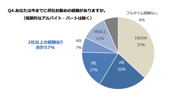 Z世代は「出退勤・残業管理する会社」を56%と過半数が支持(全体+6pt)しており、「仕事の進め方を丁寧に教えてくれる会社がいい」も77%が支持(全体+9pt)。 - これまでの転職経験者は57%と過半数。2年以内の転職実施者は15%、関心者は33%。