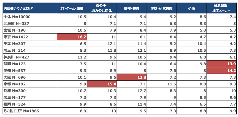働きたい業界1位が「部品製造・加工メーカー」は愛知(14.2%)、静岡(13.9%)。働きたい業界1位が「運輸・物流」は大阪(13.8%)、福岡(11.4%)。働きたい業界1位が「IT・ゲーム・通信業界」は東京(16.2%)、神奈川(11.2%)。