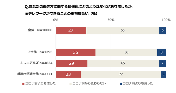 Z世代は、「出退勤や残業を管理する会社」を56%が支持(全体+6pt)。