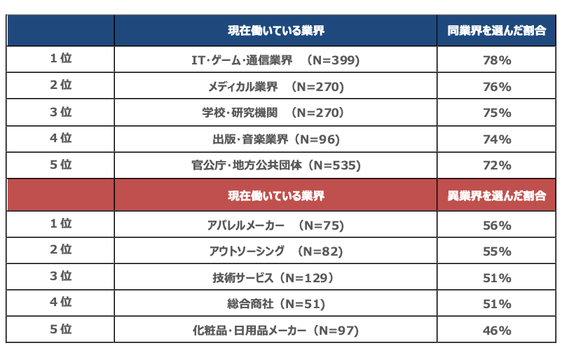 - 仕事を変えても同じ業界を選ぶ割合が高い業界1位は「IT・通信・ゲーム業界」