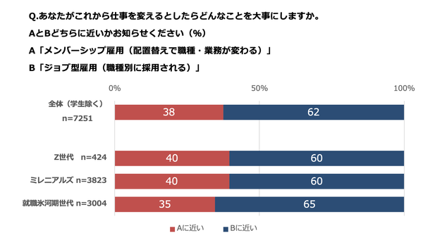 「違う業界より、同じ業界がいい」が65%、職種別採用の「ジョブ型雇用」も62%が支持。