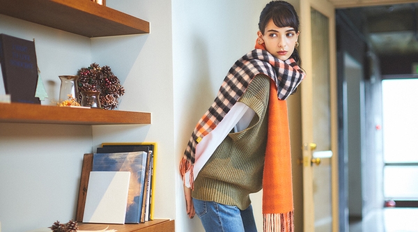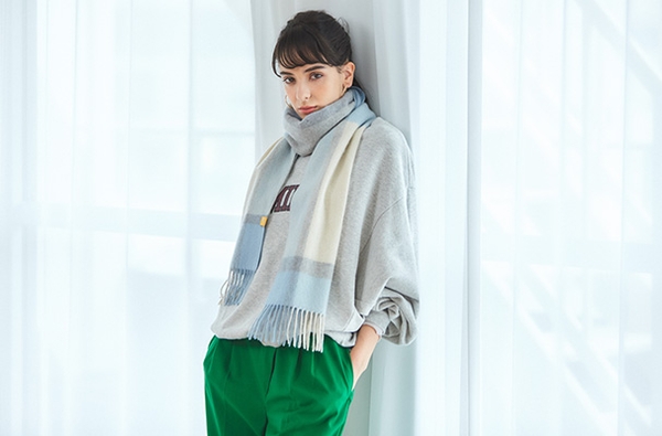 ほどよい厚みで、旬のボリュームコーデが楽しめるマフラー。