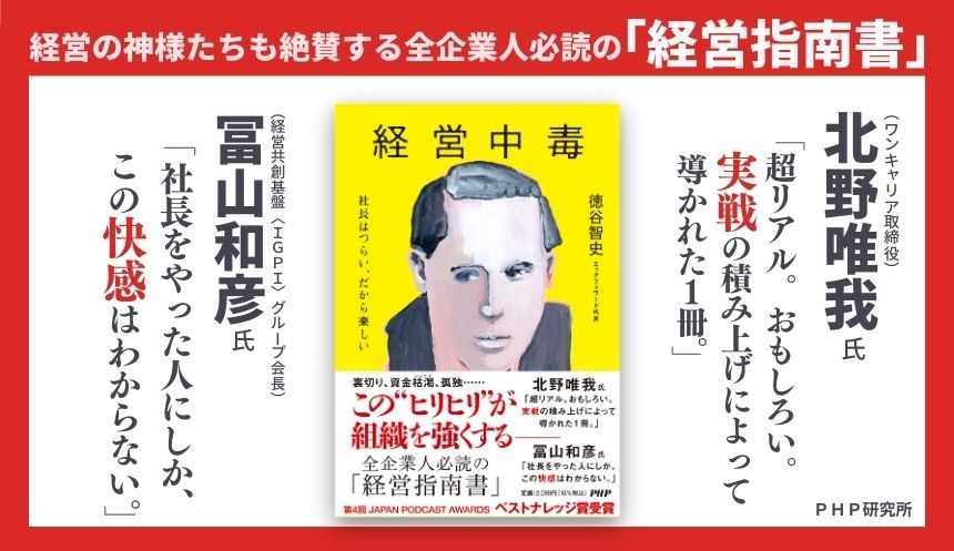 株式会社PHP研究所(京都市南区・代表取締役社長 瀬津要)は、2024 年2月29日に『経営中毒――社長はつらい、だから楽しい』(徳谷智史 著/税込 2,090円)を発売します。本書は、大企業からベンチャーまで1,000社以上の企業変革を支援してきたエッグフォワード代表の徳谷智史氏が、組織マネジメントについて体系的にまとめた経営書です。第4回 JAPAN PODCAST AWARDS(*)ベストナレッジ賞を受賞した同名音声コンテンツを大幅に加筆し、書籍化しました。