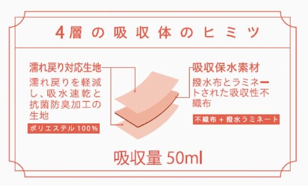 吸水ショーツのマチは4層構造の吸収体で、吸収量はしっかり50ml。ブルーデイは、多い日で約45mlだといわれています。多い日でもナプキンからの漏れを心配することなく、安心して使用できる吸水力にこだわりました。