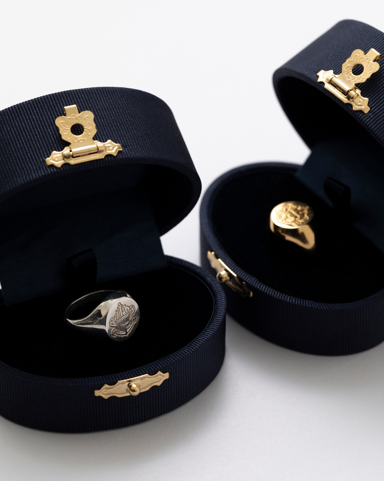 50年の軌跡を刻む特別なシグネットリング。50周年を記念して製作したオリジナルの紋章をモチーフとしてあしらい、プリミティブな印象を残しつつ、両サイドの「S」とアンカー(碇)を立体的に彫ってボリュームを出し、アームは細く仕上げた洗練されたデザインです。素材は925シルバーと、K18ゴールドメッキ925シルバーを採用。原型作製から生産、研磨、錬金など全工程を日本で行なったこだわりの一品です。