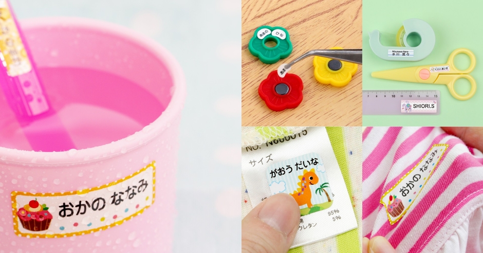 ラミネート防水で食洗機・レンジ対応のお名前シールは、文具からお箸などの細かい食器類まで色々なものに貼ることができます。