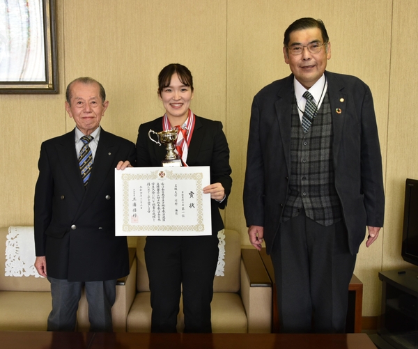 川村さんについて「センスが良く、動きが他の選手とは全然違う。さらに、頑張り屋で負けん気が強い」と評するコーチの田中さん。さらに「優勝できたのは去年の悔しさもあったと思います」と愛弟子の勝因を分析し、創部60周年という節目の年に久しぶりの全国優勝ができたことを喜んでいました。小原学長は「次の大会でも好成績を収めて、また報告に来てください」と期待しました。