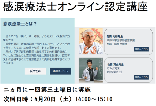 ▼ 感涙療法士認定講座HP:https://www.ruikatsu.net/kanruiryohoshi