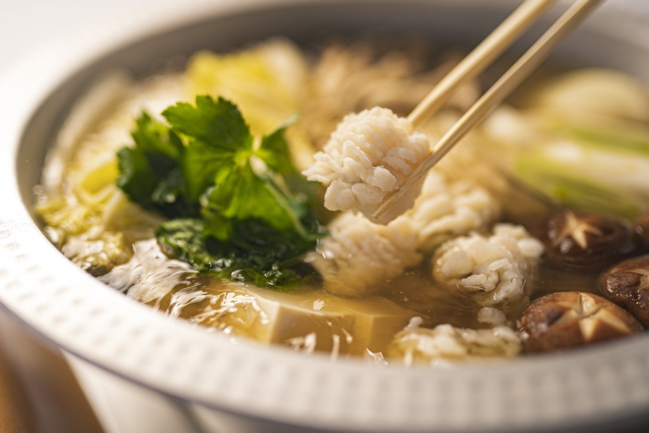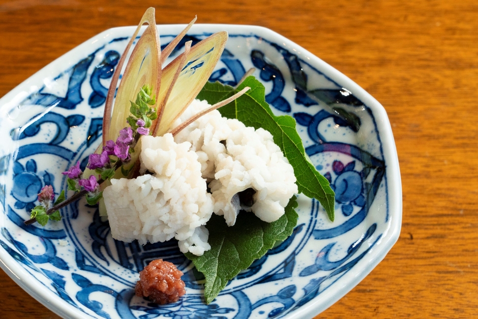 丁寧に引いた出汁に骨切りを施した鱧を合わせた“鱧吸い”は、澄んだ味わいの中に、鱧ならではの香りと旨みがやわらかく広がる余韻まで美しい一椀です。夏の定番でもある“鱧の湯引き 梅肉のせ”は、料理人の技が光る骨切りと、さっと湯にくぐらせたふっくらとした身が魅力。爽やかな梅肉の酸味が重なり、暑い時期でもさらりと箸が進みます。また、シンプルに焼き上げた“鱧の白焼き”は、皮目の香ばしさと身の弾力が際立ち、鱧本来の味わいを堪能していただける一皿。そして、“鱧鍋”は、澄んだ出汁の中で花が咲くようにほころぶ鱧と季節の野菜を合わせ、鱧の旨みが溶け込んだ滋味深い一椀に仕立てています。締めくくりには、“土鍋の鱧ごはん”を用意。鱧と出汁の旨みをじっくりと含ませながら炊き上げ、蓋を開けた瞬間に立ちのぼる香りから最後のひと口まで、夏の淡路島の恵みを感じていただけます。