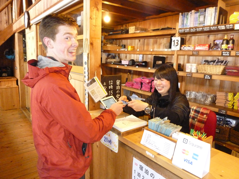 穂高岳山荘は、こうした登山者の不安を軽減するため、クレジットカード決済も受け付けることのできるモバイルPOS「Square(スクエア)」(*2)の導入を検討し、昨年(2014年)、フロントや売店などで試験運用しました。店頭POPのみでクレジットカード払いをご案内したところ、お客様の3%がお支払いにクレジットカードを利用(*3)し、特に、悪天による連泊時や、外国からのお客様に好評でした。最大の懸案だった山小屋の不安定な通信インフラ環境でも、スムーズに運用でき、今回、本格的に導入することを決めました。